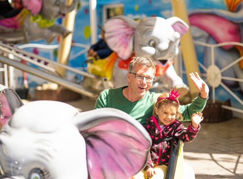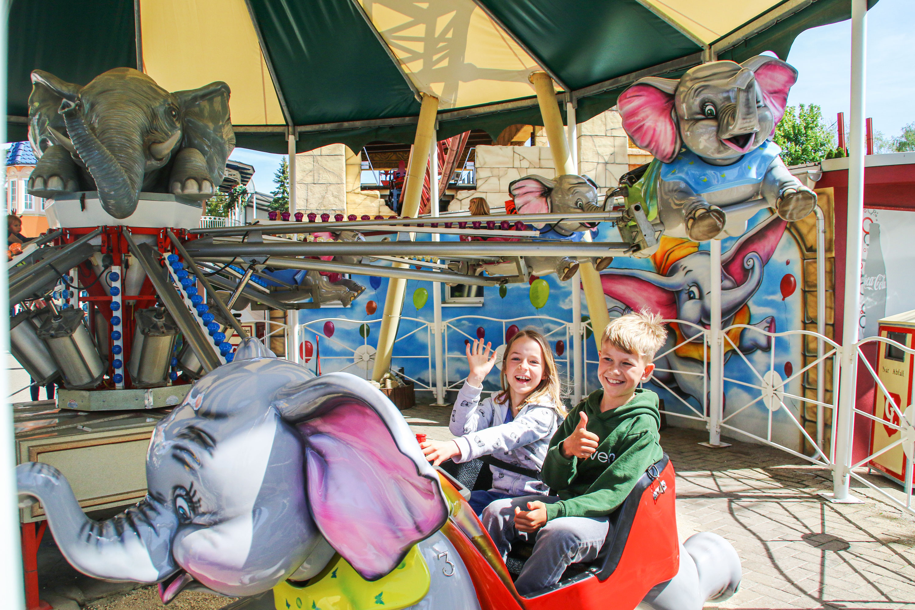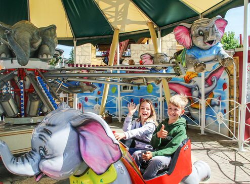 Elefanten, die in die Luft gehen! Ja, auch das bietet der Freizeitpark Conny-Land – allerdings sind die Elefanten Teil eines außergewöhnlichen Karussels – und damit geht es für die jüngsten Besucher hoch hinaus. Ein luftiger Spaß!